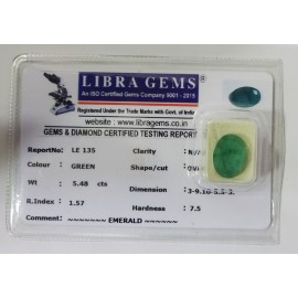 REPORT NO . LE 135CLARITY . N/ACOLOUR . GREENSHAPE / CUT . OVALWT . 5.48 CTSDIMENSION . 3-9.10-5.5-3.R . INDEX . 1.57HARDNESS . 7.5COMMENT . EMERALD..