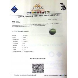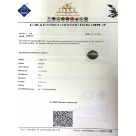 DATE: 14-4-2025REF.NO: LC 1174NAME: CATS EYEWEIGHT: 5.00 CTSCOLOUR: GREENTYPE OF/CUT: OVALDIMENSION: 3.5-10.3-5.3/CONCLUSION: N/AHARDNESS: 7.5R.INDEX: 1.54-1.55CLARITY: N/ASPECIFIC COMMENTS: CATS EYE ..