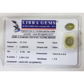 REPORT NO . LC 114CLARITY . N/ACOLOUR . L . GREENSHAPE / CUT . OVALWT . 4.78 CTSDIMENSION . 10-5.9-3.6-9.R . INDEX . 1.54-1.55HARDNESS . 7.5COMMENT . CATS EYE { S . QUARTZ }..