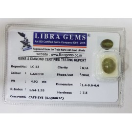 REPORT NO . LC 13CLARITY . N/ACOLOUR . L . GREENSHAPE / CUT . OVALWT . 4.92 CTSDIMENSION . 1-4.9-6.6-6.R . INDEX . 1.54-1.55HARDNESS . 7.5COMMENT . CATS EYE { S . QUARTZ }..