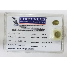 REPORT NO . LC 160CLARITY . N/ACOLOUR . L . GREENSHAPE / CUT . OVALWT . 3.23 CTSDIMENSION . 9-9.8-4.5-7.R . INDEX . 1.54-1.55HARDNESS . 7.5COMMENT . CATS EYE { S . QUARTZ }..