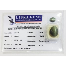 REPORT.NO.-LC 330CLARITY.-N/ACOLOUR.-GREENSHAPE/CUT.-OVALWT.-11.10 CTSDIMENSION.-4-6.2-1.9-1.R.INDEX.-1.54-1.55HARDNESS.-7.5COMMENT.-CATS EYE { S . QUARTZ }..