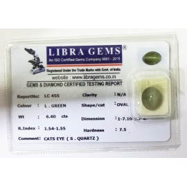 REPORT.NO.LC 748CLARITY.N/ACOLOUR.GREEN SHAPE/CUT.OVAL WT.4.61 CTS DIMENSION.2.7-10.2-5.1R.INDEX.1.54-1.55HARDNESS.7.5COMMENT.CATS EYE {S.QUATRZ}..