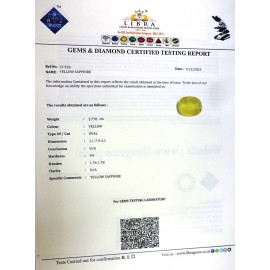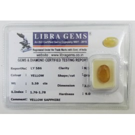 REPORT NO . LY 45CLARITY . N/ACOLOUR . YELLOWSHAPE / CUT . OVALWT . 9.97 CTSDIMENSION . 2-6.1-2.7-3.R . INDEX . 1.76-1.78HARDNESS . 9.0COMMENT . YELLOW SAPPHIRE..