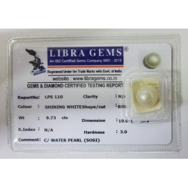 REPORT NO . LPS 110CLARITY . N/ACOLOUR . SHINING WHITESHAPE /  CUT . ROUNDWT . 9.73 CTSDIMENSION . 10-9.1-1.10-9.R . INDEX . N/AHARDNESS . 3.0COMMENT . C / WATER PEARL { SOSI }..