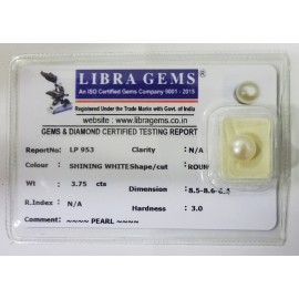 REPORT NO . LP 953CLARITY . N/ACOLOUR . SHINING WHITESHAPE / CUT . ROUNDWT . 3.75 CTSDIMENSION . 8-5.8-6.6-4.R . INDEX . N/AHARDNESS . 3.0COMMENT . PEARL..