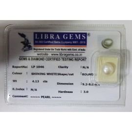 REPORT NO. LP 1046CLARITY. N/ACOLOUR. SHINING WHITESHAPE/CUT.ROUNDWT. 4.13 CTSDIMENSION. 9.2-8.8-6.4R.INDEX. 1046HARDNESS. 3.0COMMENT. PEARL..