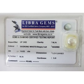 REPORT NO . LP 242CLARITY . N/ACOLOUR . SHINING WHITESHAPE / CUT . ROUNDWT . 9.02 CTSDIMENSION . 1-5.1-6.8-5.R . INDEX . N/AHARDNESS . 3.0COMMENT . PEARL..