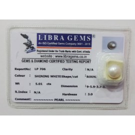 REPORT NO . LP 706CLARITY . N/ACOLOUR . SHINING WHITESHAPE / CUT . ROUNDWT . 5.01 CTSDIMENSION . 9-5.9-3.7-3.R . INDEX . N/AHARDNESS . 3.0COMMENT . PEARL..