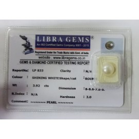 REPORT NO . LP 833CLARITY . N/ACOLOUR . SHINING WHITESHAPE / CUT . ROUNDWT . 3.92 CTSDIMENSION . 8-8.6-7.8-8.R . INDEX . N/AHARDNESS . 3.0COMMENT . PEARL..