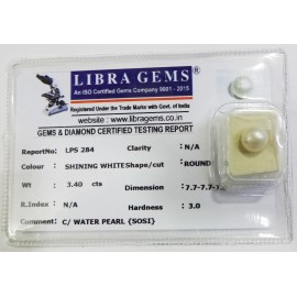 REPORT.NO.-LPS 284CLARITY.-N/ACOLOUR.-SHINING WHITESHAPE/CUT.-ROUNDWT.-3.40 CTSDIMENSION.-7-7.7-7.7-8.R.INDEX.-N/AHARDNESS.-3.0COMMENT.-C / WATER PEARL { SOSI }..