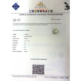 REPORT NO . LP 18CLARITY . N/ACOLOUR . SHINING WHITESHAPE / CUT . ROUNDWT . 5.49 CTSDIMENSION . 10-2.6-9.10-2.R . INDEX . N/AHARDNESS . 3.0COMMENT . PEARL..