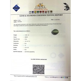 REPORT NO . LC 151CLARITY . N/ACOLOUR . L . GREENSHAPE / CUT . OVALWT . 8.48 CTSDIMENSION . 3-1.1-5.8-2.R . INDEX . 1.54-1.55HARDNESS . 7.5COMMENT . CATS EYE { S . QUARTZ }..
