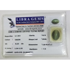 REPORT.NO.LC 293CLARITY.N/ACOLOUR.GREENSHAPE/CUT.OVALWT.8.23 CTSDIMENSION.3.8-9.8-8.6R.INDEX.1.54-1.55HARDNESS.7.5COMMENT.CATS EYE {S.QUARTZ}..