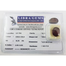 REPORT.NO.LHS 235CLARITY.N/ACOLOUR.COCA COLASHAPE/CUT.OVALWT.9.28 CTSDIMENSION.3.4-1.2-7.8R.INDEX.1.92-2.02HARDNESS.6.5-7.5COMMENT.HESSONITE {S}..