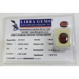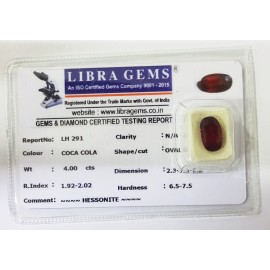 REPORT.NO.-LH 291CLARITY.-N/ACOLOUR.-COCA COLASHAPE/CUT.-OVALWT.-4.00 CTSDIMENSION.-2-3.7-3.5-2.R.INDEX.-1.92-2.02HARDNESS.-6.5-7.5COMMENT.-HESSONITE..
