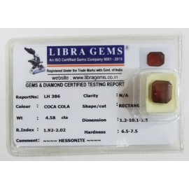 REPORT.NO.-LH 386CLARITY.-N/ACOLOUR.-COCA COLASHAPE/CUT.-RECTANGLEWT.-4.58 CTSDIMENSION.-1-2.10-1.3-5.R.INDEX.-1.92-2.02HARDNESS.-6.5-7.5COMMENT.-HESSONITE..