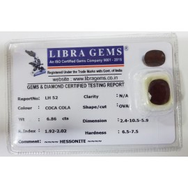 REPORT NO . LH 52CLARITY . N/ACOLOUR . COCA COLASHAPE / CUT . OVALWT . 6.86 CTSDIMENSION . 2-4.10-5.5-9.R . INDEX . 1.92-2.02HARDNESS . 6.5-7.5COMMENT . HESSONITE..