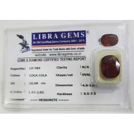 REPORT.NO.LH 584CLARITY.N/A COLOUR.COCA COLA SHAPE/CUT.OVAL WT.10.98 CTS DIMENSION.4.6-1.6-7.3R.INDEX.1.92-2.02HARDNESS.6.5-7.5COMMENT.HESSONITE..