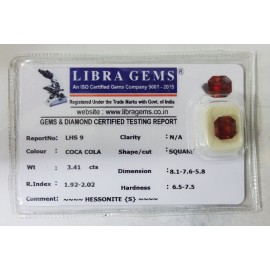 REPORT NO . LHS 9CLARITY . N/ACOLOUR . COCA COLASHAPE / CUT . SQUAREWT . 3.41 CTSDIMENSION . 8-1.7-6.5-8.R . INDEX . 1.92-2.02HARDNESS . 6.5-7.5COMMENT . HESSONITE { S }..