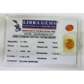 REPORT.NO.LY 381CLARITY.N/ACOLOUR.YELLOWSHAPE/CUT.OVALWT.6.08 CTSDIMENSION.1.2-8.4-5.9R.INDEX.1.76-1.78HARDNESS.9.0COMMENT.YELLOW SAPPHIRE..