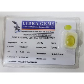 REPORT NO . LYA 26CLARITY . N/ACOLOUR . YELLOWSHAPE / CUT . OVALWT . 4.19 CTSDIMENSION . 1-7.8-3.4-4.R . INDEX . 1.76-1.78HARDNESS . 9.0COMMENT . YELLOW SAPPHIRE..