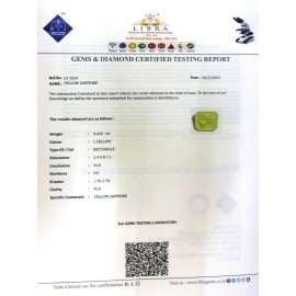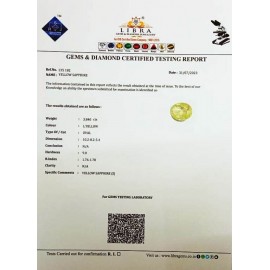 REPORT NO . LYA 44CLARITY . N/ACOLOUR . YELLOWSHAPE / CUT . OVALWT . 3.29 CTSDIMENSION . 10-3.7-1.5-1.R . INDEX . 1.76-1.78HARDNESS . 9.0COMMENT . YELLOW SAPPHIRE { A }..