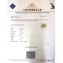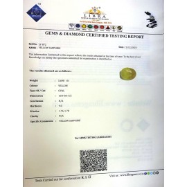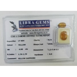 REPORT NO . LY 199CLARITY . N/ACOLOUR . YELLOW SHAPE / CUT . OVALWT . 5.01 CTSDIMENSION . 10-5.8-5.5-8.R . INDEX . 1.76-1.78HARDNESS . 9.0COMMENT . YELLOW SAPPHIRE..