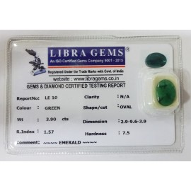 REPORT NO . LE 10CLARITY . N/ACOLOUR . GREENSHAPE / CUT . OVALWT . 3.90 CTSDIMENSION . 2-9.9-6.3-9.R . INDEX . 1.57HARDNESS . 7.5COMMENT . EMERALD..