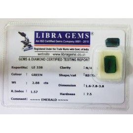 REPORT.NO.-LE 338CLARITY.-N/ACOLOUR.-GREENSHAPE/CUT.-RECTANGLEWT.-2.88 CTSDIMENSION.-1.6-7.8-3.8R.INDEX.-1.57HARDNESS.-7.5COMMENT.-EMERALD..
