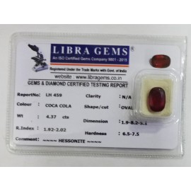 REPORT.NO.-LH 459CLARITY.-N/ACOLOUR.-COCA COLASHAPE/CUT.-OVALWT.-4.37 CTSDIMENSION.-1-9.8-2.5-1.R.INDEX.-1.92-2.02HARDNESS.-6.5-7.5COMMENT.-HESSONITE..