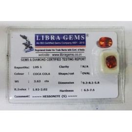 REPORT NO . LH 70CLARITY . N/ASHAPE / CUT . OVALCOLOUR . COCA COLAWT . 3.88 CTSDIMENSION . 1-4.7-9.4-5.R . INDEX . 1.92-2.02HARDNESS . 6.5-7.5COMMENT . HESSONITE..