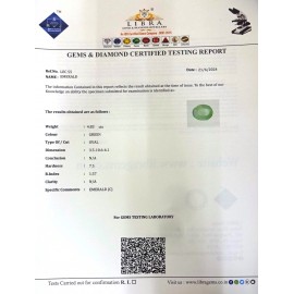 DATE:21-9-2024REF.NO:LE 1534NAME:EMERALD WEIGHT:6.22 CTSCOLOUR:GREENTYPE OF/CUT:OVALDIMENSION:5.2-1.2-4.4CONCLUSION:N/AHARDNESS:7.5R.INDEX:1.57CLARITY:N/ASPECIFIC COMMENTS:EMERALD..