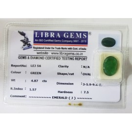 REPORT NO . LEJ 56CLARITY . N/ACOLOUR . GREENSHAPE / CUT . OVALWT . 4.87 CTSDIMENSION . 3-5.9-9.4-6.R . INDEX . 1.57HARDNESS . 7.5COMMENT . EMERALD { J }..