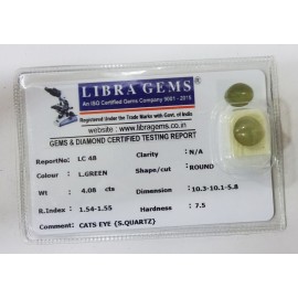 REPORT NO . LC 48CLARITY . N/ACOLOUR . L . GREENSHAPE / CUT . ROUNDWT . 4.08 CTSDIMENSION . 10-3.10-1.5-8.R . INDEX . 1.54-1.55HARDNESS . 7.5COMMENT . CATS EYE { S . SQUARTZ }..