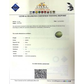 REPORT.NO.-LC 484CLARITY.-N/ACOLOUR.-L . GREENSHAPE/CUT.-OVALWT.-8.25 CTSDIMENSION.-3-4.10-7..8-7.R.INDEX.-1.54-1.55HARDNESS.-7.5COMMENT.-CATS EYE { S . QUARTZ }..
