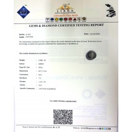 REPORT NO . LC 242CLARITY . N/ACOLOUR . GREENSHAPE / CUT . OVALWT . 6.46 CTSDIMENSION . 3-6.9-5.6-6.R . INDEX . 1.54-1.55HARDNESS . 7.5COMMENT . CATS EYE { S . QUARTZ }..