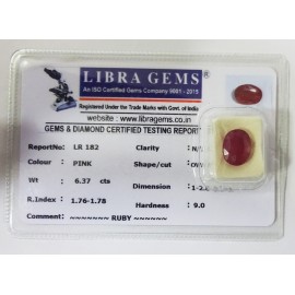 REPORT NO . LR 182CLARITY . N/ACOLOUR . PINKSHAPE / CUT . OVALWT . 6.37 CTSDIMENSION . 1-2.8-8.5-8.R . INDEX . 1.76-1.78HARDNESS . 9.0COMMENT . RUBY..