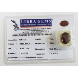 REPORT.NO.-LH 411CLARITY.-N/ACOLOUR.-COCA COLASHAPE/CUT.-OVALWT.-8.12 CTSDIMENSION.-3-9.10-3.6-7.R.INDEX.-1.92-2.02HARDNESS.-6.5-7.5COMMENT.-HESSONITE..