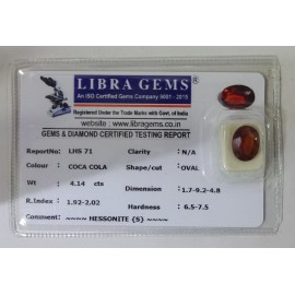 REPORT NO . LHS 71CLARITY . N/ACOLOUR . COCA COLASHAPE / CUT . OVALWT . 4.14 CTSDIMENSION . 1-7.9-2.4-8.R . INDEX . 1.92-2.02HARDNESS . 6.5-7.5COMMENT . HESSONITE { S }..