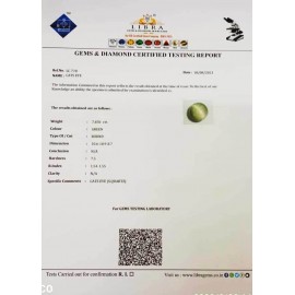 REPORT NO . LCK 5CLARITY . N/ACOLOUR . L . GREENSHAPE / CUT . OVALWT . 3.87 CTSDIMENSION . 9-4.6-3.6-6.R . INDEX . 1.54-1.55HARDNESS . 7.5COMMENT . CATS EYE { K }..