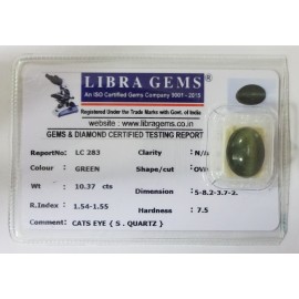 REPORT NO . LC 283CLARITY . N/ACOLOUR . GREENSHAPE / CUT . OVALWT . 10.37 CTSDIMENSION . 5-8.2-3.7-2.R . INDEX . 1.54-1.55HARDNESS . 7.5COMMENT . CATS EYE { S . QUARTZ }..