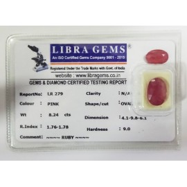 REPORT.NO.-LR 279CLARITY.-N/ACOLOUR.-PINKSHAPE/CUT.-OVALWT.-8.24 CTSDIMENSION.-4.1-9.8-6.1R.INDEX.-1.76-1.78HARDNESS.-9.0COMMENT.-RUBY..