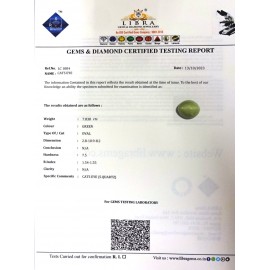 DATE: 14-4-2025REF.NO: LC 1168NAME: CATS EYEWEIGHT: 3.09 CTSCOLOUR: GREENTYPE OF/CUT: OVALDIMENSION: 10.6-9.2-4.5/CONCLUSION: N/AHARDNESS: 7.5R.INDEX: 1.54-1.55CLARITY: N/ASPECIFIC COMMENTS: CATS EYE ..
