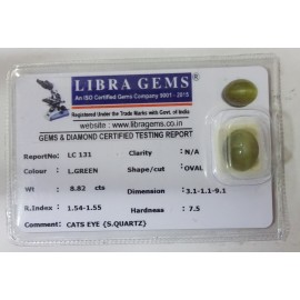 REPORT NO . LC 131CLARITY . N/ACOLOUR . L . GREENSHAPE / CUT . OVALWT . 8.82 CTSDIMENSION . 3-1.1-1.9-1.R . INDEX . 1.54-1.55HARDNESS . 7.5COMMENT . CATS EYE { S . QUARTZ }..
