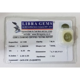 REPORT NO . LC 166CLARITY . N/ACOLOUR . L . GREENSHAPE / CUT . OVALWT . 4.33 CTSDIMENSION . 1-7.10-3.5-3.R . INDEX . 1.54-1.55HARDNESS . 7.5COMMENT . CATS EYE { S . QUARTZ }..