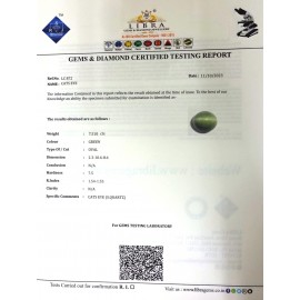 REPORT.NO.LC 763CLARITY.N/ACOLOUR.GREEN SHAE/CUT.OVAL WT.6.09 CTS DIMENSION.2.1-8.4-8.4R.INDEX.1.54-1.55HARDNESS.7.5COMMENT.CATS EYE {S.QUATRZ}..