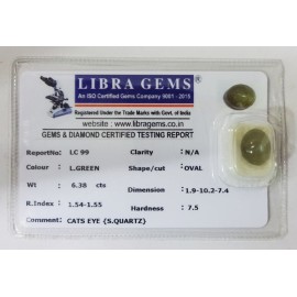 REPORT NO . LC 99CLARITY . N/ACOLOUR . L . GREENSHAPE / CUT . OVALWT . 6.38 CTSDIMENSION . 10-9.10-2.7-4.R . INDEX . 1.54-1.55HARDNESS . 7.5COMMENT . CATS EYE { S . SQUARTZ }..