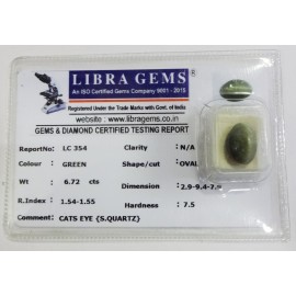 REPORT.NO.-LC 354CLARITY.-N/ACOLOUR.-GREENSHAPE/CUT.-OVALWT.-6.72 CTSDIMENSION.-2-9.9-4.7-9.R.INDEX.-1.54-1.55HARDNESS.-7.5COMMENT.- CATS EYE { S . QUARTZ }..