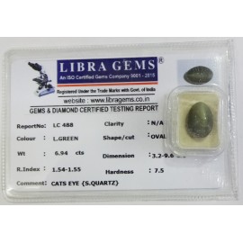 REPORT.NO.-LC 488CLARITY.-N/ACOLOUR.-L . GREENSHAPE/CUT.-OVALWT.-6.94 CTSDIMENSION.-3-2.9-6.8-1.R.INDEX.-1.54-1.55HARDNESS.-7.5COMMENT.-CATS EYE { S . QUARTZ }..